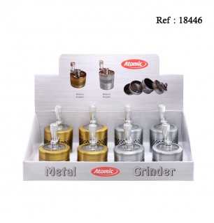 Voici un grinder moulin en métal de la marque Atomic. Le grinder a un diamètre de 4 centimètres. Le grinder sera livré par display de 4 avec le coloris doré et argenté de disponible.